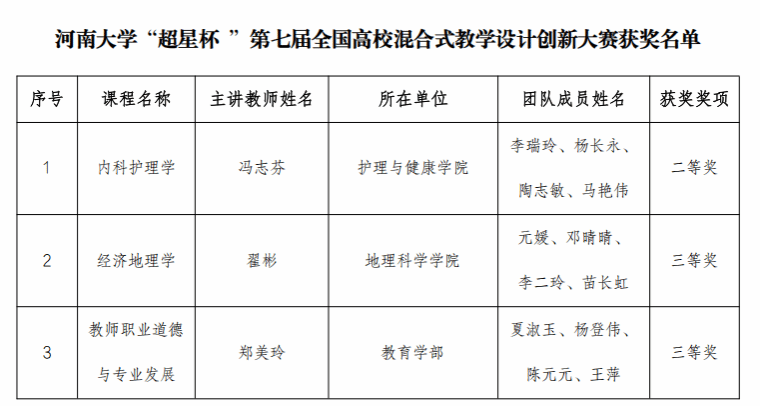 近日,由全国高校混合式教学设计创新大赛组委会、高校教学发展网络及中国电子教育学会联合主办的“超星杯”第七届全国高校混合式教学设计创新大赛获奖名单正式揭晓。经过激烈角逐,我校参赛教师团队斩获国家级奖项三项,其中护理与健康学院冯志芬团队主讲的《内科护理学》荣获二等奖、地理科学学院学院翟彬团队主讲的《经济地理学》和教育学部郑美玲团队主讲的《教师职业道德与专业发展》荣获三等奖。